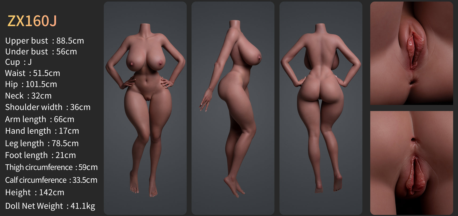 ZELEX SLE's hips employ biomechanical simulation design, accurately recreating the gluteal muscle curvature and natural cleft depression. The skin surface features realistic sitting wrinkles and cellulite texture, with gradient pressure blushing in weight-bearing areas. Even the shadow transitions in the gluteal fold are vividly reproduced.
